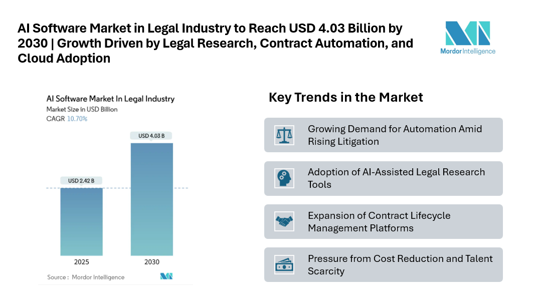 The AI software market in the legal industry is experiencing significant expansion, with its value expected to rise from USD 2.42 billion in 2025 to USD 4.03 billion by 2030, reflecting a compound annual growth rate (CAGR) of 10.7%. Increasing litigation volumes, pressure to reduce operational costs, and the adoption of intelligent automation are driving law firms and corporate legal departments to integrate AI tools across research, contract management, and compliance workflows.