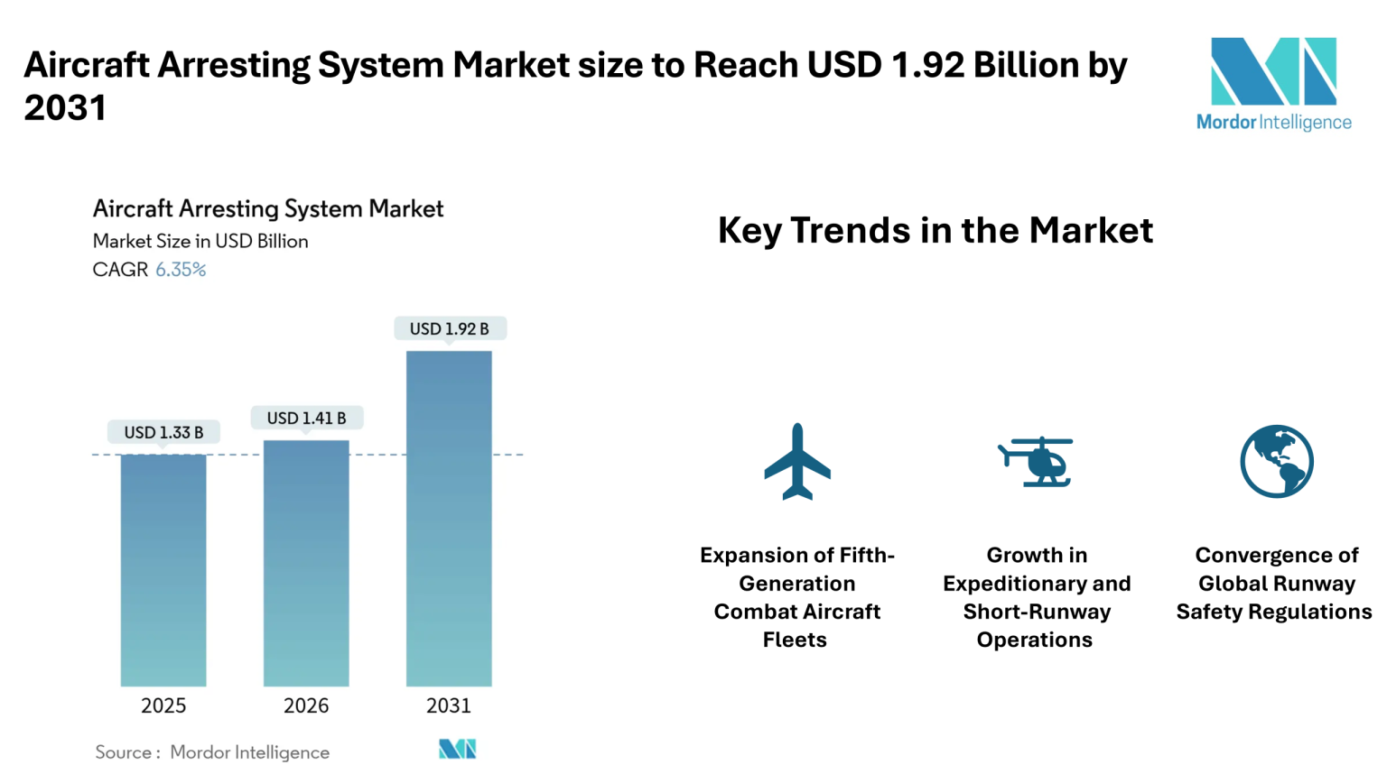 According to Mordor Intelligence, the aircraft arresting system market size was valued at USD 1.41 billion in 2026 and reach USD 1.92 billion by 2031, registering a CAGR of 6.35% during the forecast period. The aircraft arresting system market size is supported by rising investments in advanced fighter aircraft, aircraft carrier modernization programs, and stricter runway safety requirements across commercial airports.