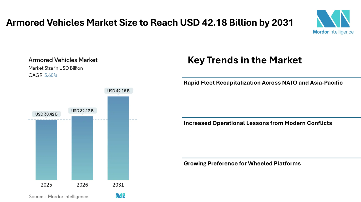 According to Mordor Intelligence, the armored vehicles market size is projected to grow from USD 30.42 billion in 2025 to USD 32.12 billion in 2026 and is expected to reach USD 42.18 billion by 2031, registering a CAGR of 5.6% during the forecast period. The armored vehicles industry is witnessing steady expansion as governments accelerate fleet replacement programs and strengthen land-force capabilities.