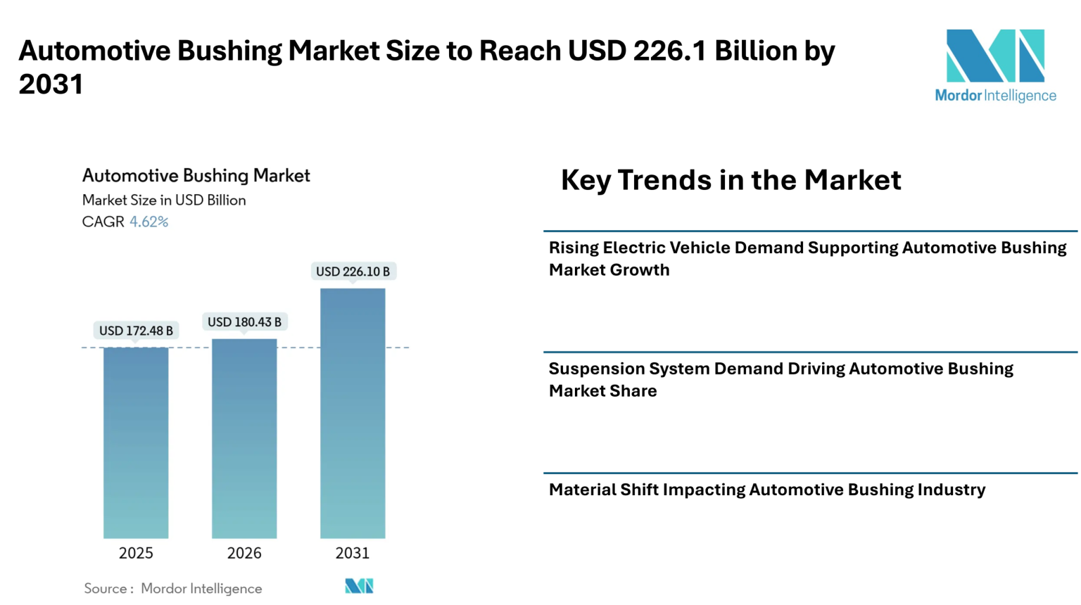 According to Mordor Intelligence, the automotive bushing market size is projected to grow from USD 172.48 billion in 2025 to USD 180.43 billion in 2026 and is expected to reach USD 226.1 billion by 2031, registering a CAGR of 4.62% during the forecast period. The study on automotive bushing market size indicates steady expansion as vehicle production stabilizes and electrification gains pace across major regions.