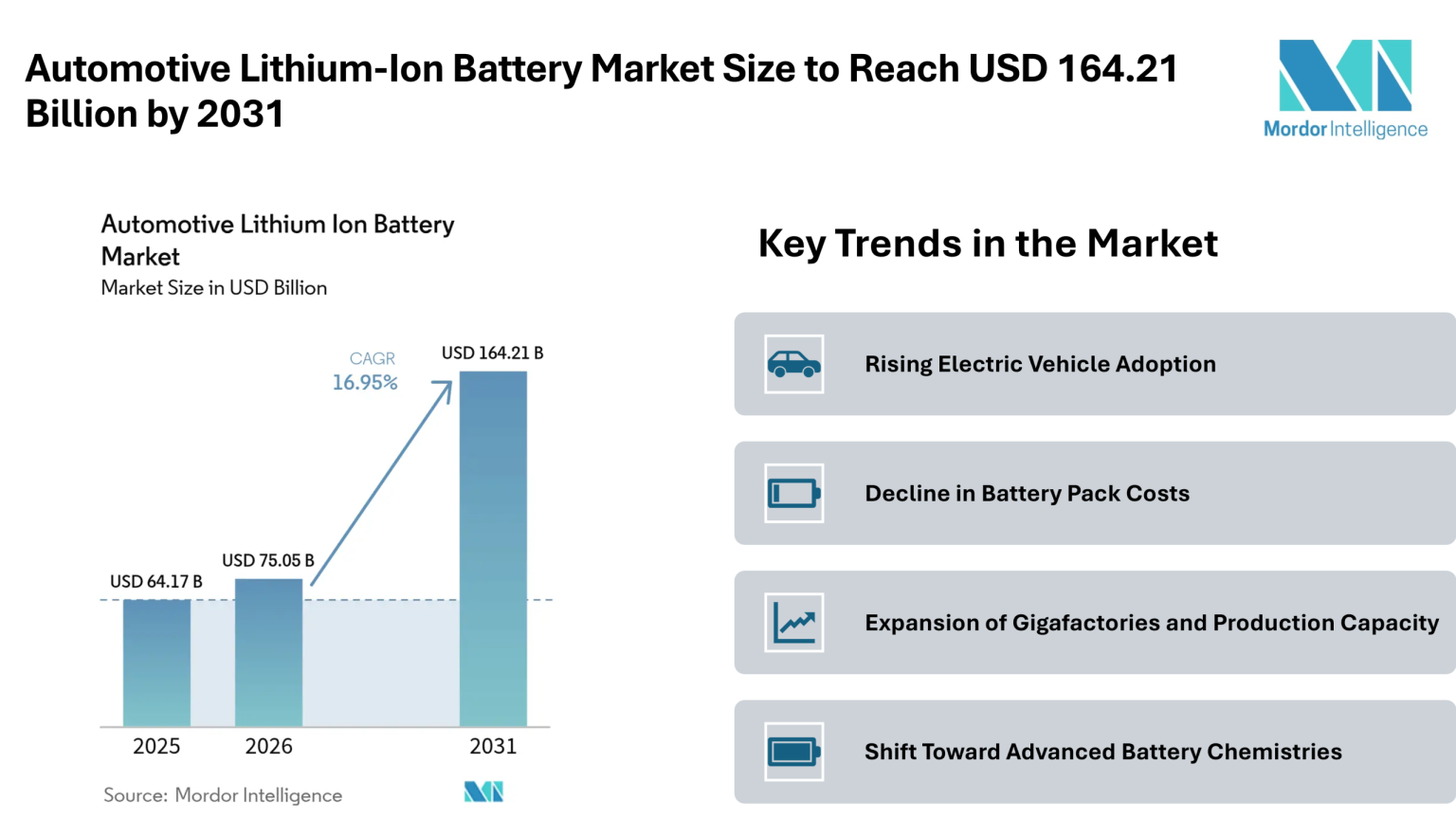 According to Mordor Intelligence, the automotive lithium-ion battery market size is estimated at USD 75.05 billion in 2026, growing from USD 64.17 billion in 2025, and is projected to reach USD 164.21 billion by 2031 at a CAGR of 16.95%. This automotive lithium-ion battery market growth is closely tied to increasing electric vehicle adoption, stricter emission regulations, and ongoing improvements in battery cost and efficiency.