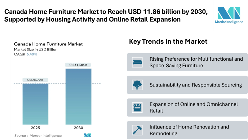 According to the Mordor Intelligence, the Canada Home Furniture Market size is estimated at USD 8.70 billion in 2025, and is expected to reach USD 11.86 billion by 2030, at a CAGR of 6.40%, reflecting consistent demand across urban and suburban households. This growth is closely linked to homeownership trends, migration into metropolitan regions, and increased focus on interior comfort and functionality. The Canada home furniture market continues to show steady momentum, supported by residential construction activity, renovation spending, and changing lifestyle preferences.