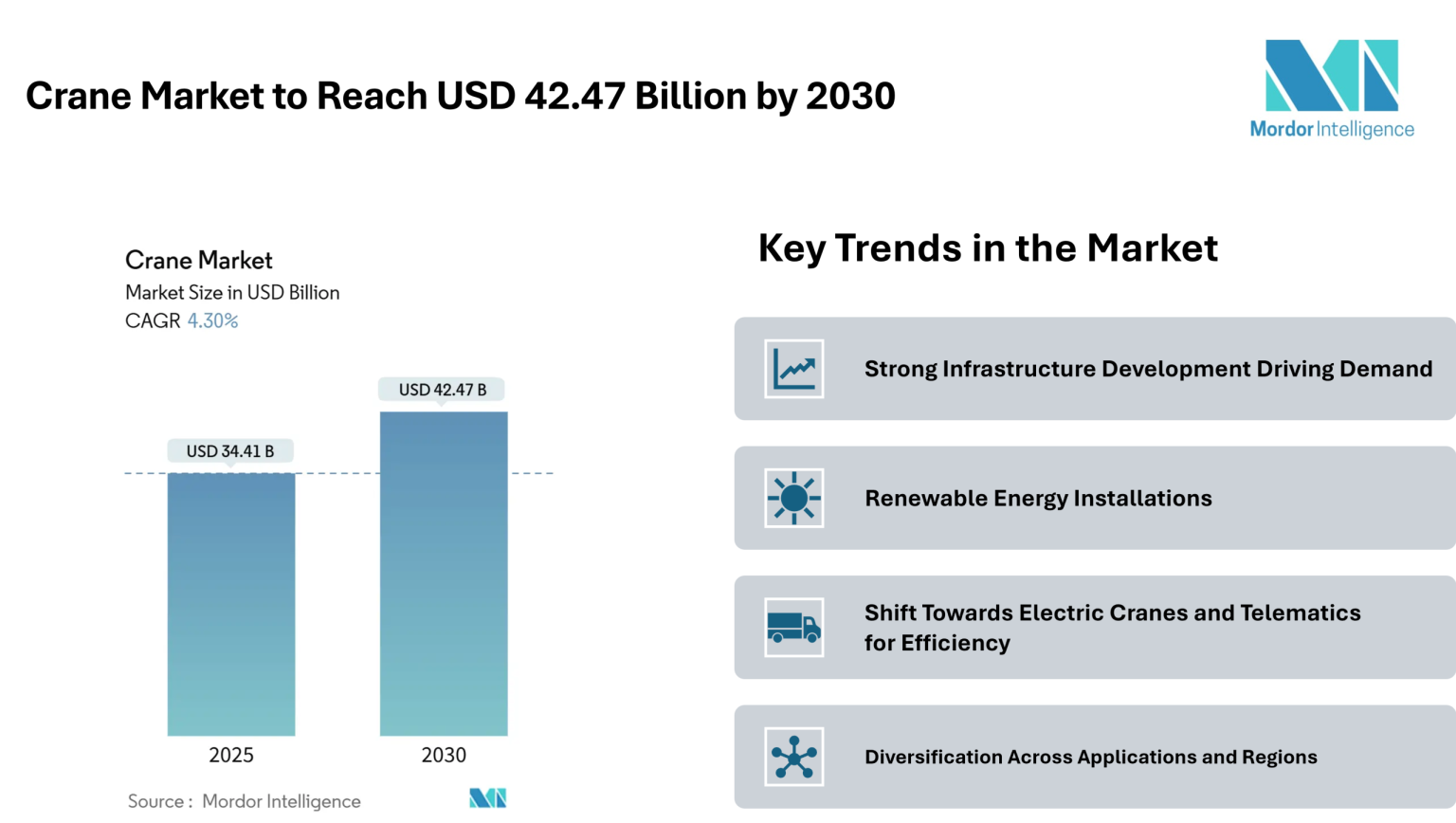The crane market reached USD 34.41 billion in 2025 and is projected to advance to USD 42.47 billion by 2030, translating into a 4.30% CAGR. This growth is underpinned by a variety of factors, including increased public infrastructure spending, large-scale private megaprojects, and a growing emphasis on renewable energy installations. As the world navigates evolving construction needs and energy transitions, the demand for versatile, high capacity lifting equipment continues to rise.