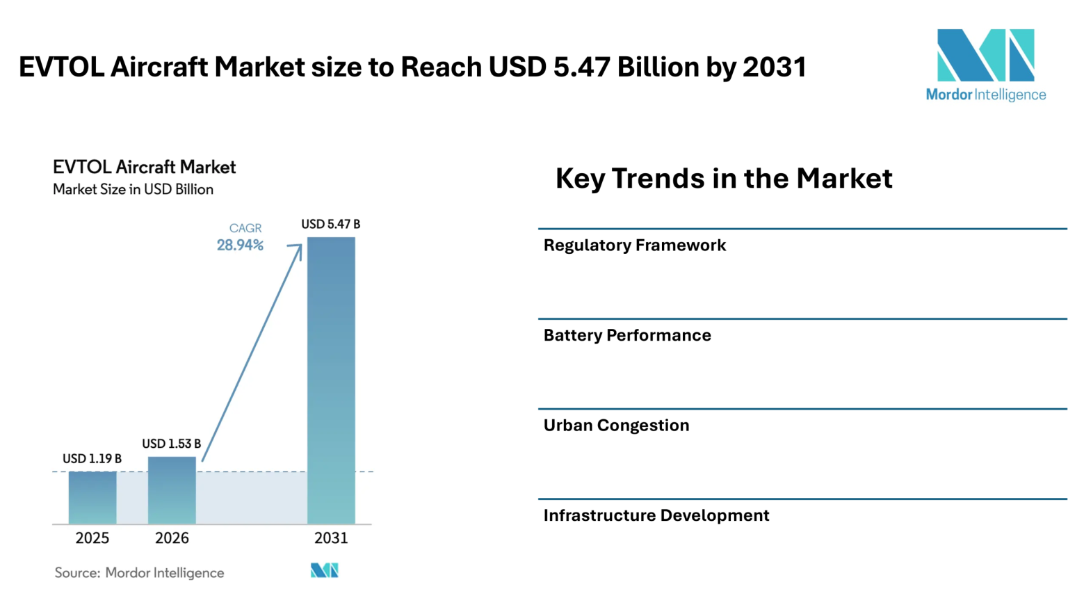 According to Mordor Intelligence, the eVTOL aircraft market size is expected to grow from USD 1.19 billion in 2025 to USD 1.53 billion in 2026 and is projected to reach USD 5.47 billion by 2031, registering a CAGR of 28.94% during the forecast period.