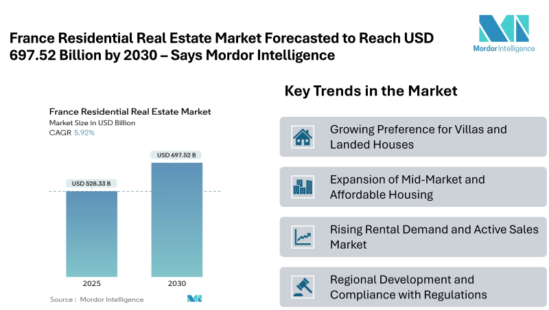 According to Mordor Intelligence, the France residential real estate market size is valued at USD 528.33 billion in 2025 and is forecast to expand to USD 697.52 billion by 2030, reflecting a 5.92% CAGR.