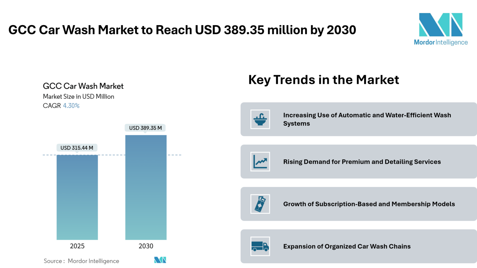 According to the Mordor Intelligence report, The GCC Car Wash Market size is estimated at USD 315.44 million in 2025, and is expected to reach USD 389.35 million by 2030, at a CAGR of 4.30% during the forecast period (2025-2030), reflecting the increasing penetration of automatic, conveyor-based, and subscription-driven car wash services across major Gulf countries.