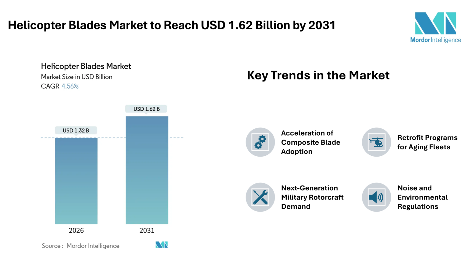 The Helicopter Blades Market size is projected to grow from an estimated USD 1.32 billion in 2026 to USD 1.62 billion by 2031, registering a CAGR of 4.56% during the forecast period. Growth is anchored in the accelerating shift from metal to composite blades, expanding retrofit activity across aging fleets, and next-generation military rotorcraft programs that require enhanced blade performance. Composite materials now account for most of the revenue, while automation in manufacturing is shortening production cycles, enabling suppliers to better meet delivery timelines. Demand is further supported by rising helicopter utilization in civil missions such as offshore crew transport and search-and-rescue operations, which drive higher blade replacement and service activity.