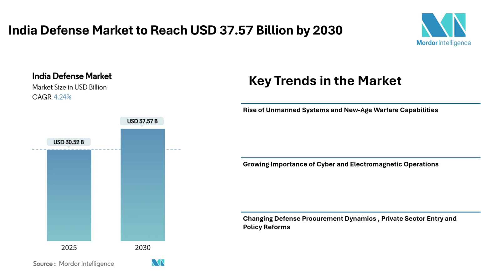 The india defense market stands at a critical juncture. With a projected growth to around USD 37.6 billion by 2030, the market is entering a phase where modernization, diversification, and self-reliance are becoming the defining themes. The combination of increased defense budgets, domestic sourcing mandates, and greater private-sector participation is transforming the supply landscape.