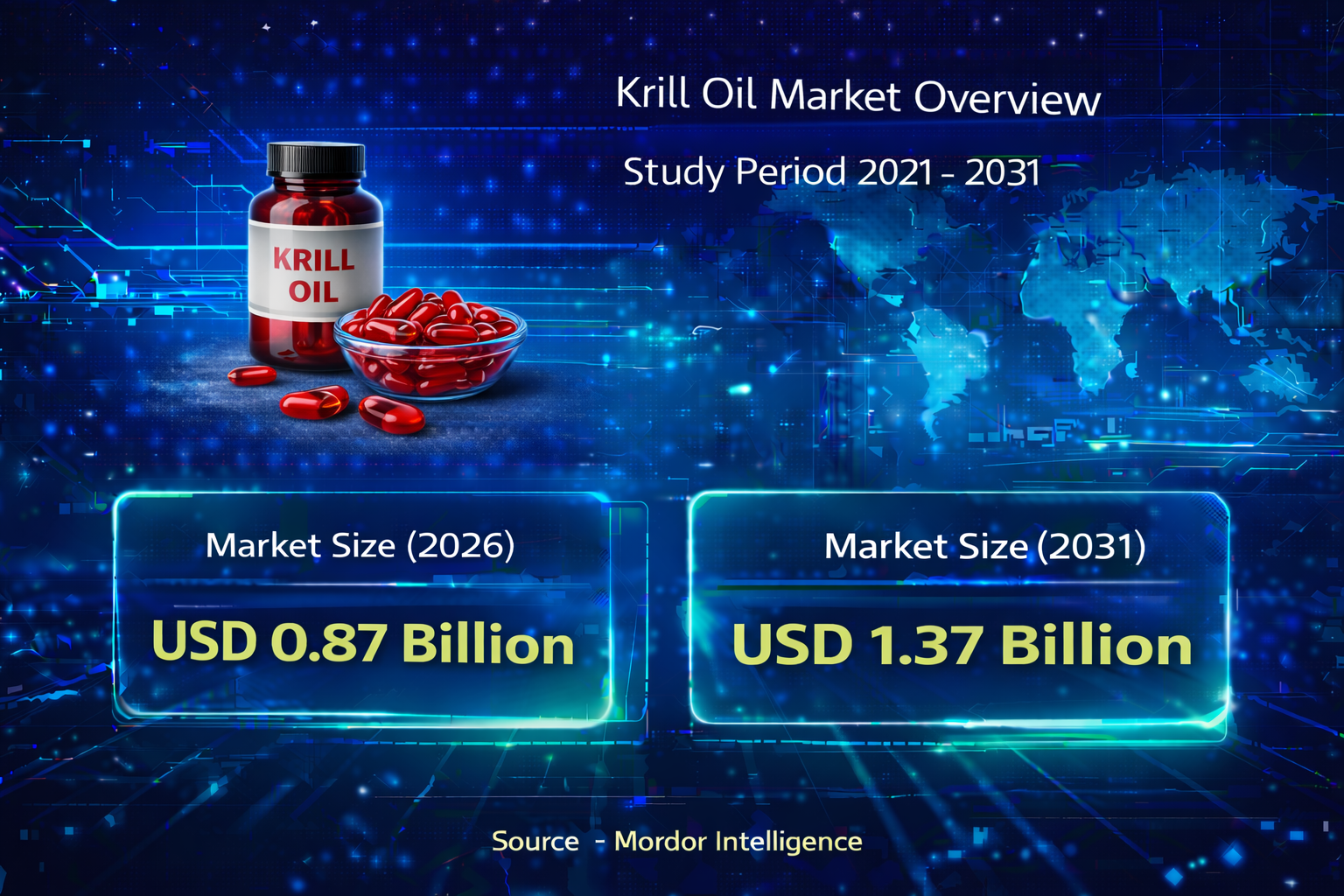 The global krill oil market is steadily expanding, with the market size projected to grow from USD 0.87 billion in 2026 to reach an estimated USD 1.37 billion by 2031. This growth reflects increasing consumer interest in omega-3 fatty acids and their health benefits, particularly for cardiovascular and cognitive wellness.