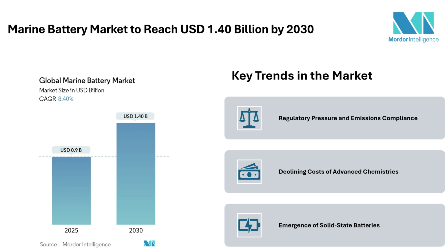 The marine battery market is forecast to expand significantly, with its market size projected to grow from USD 0.9 billion in 2025 to approximately USD 1.40 billion by 2030, according to a recent intelligence report by Mordor Intelligence. This represents a compound annual growth rate (CAGR) of around 8.40 percent during the forecast period. Key trends fueling this growth include stricter emissions regulations, innovations in battery chemistry, and growing investments in electric and hybrid marine propulsion systems.