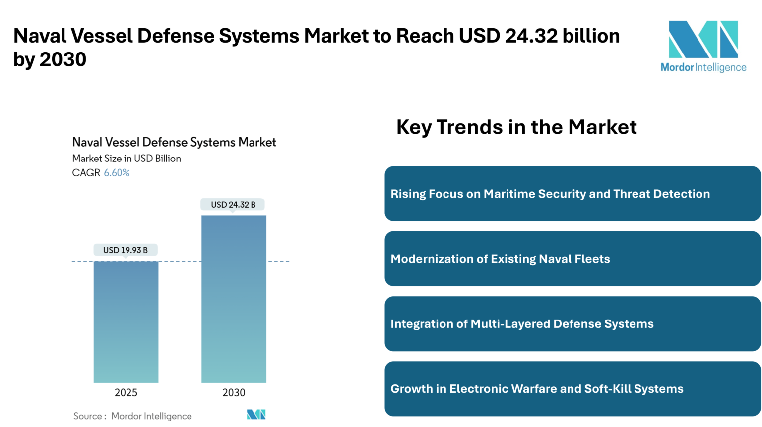 The Naval Vessel Defense Systems Market is projected to grow from an estimated USD 19.93 billion in 2025 to USD 24.32 billion by 2030, registering a CAGR of 6.60% over the forecast period from 2025 to 2030.