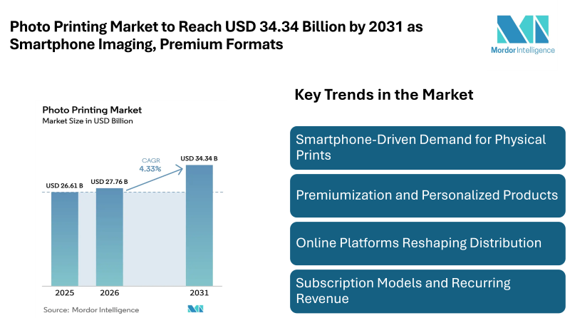 According to Mordor Intelligence, the global photo printing market size was valued at USD 26.61 billion in 2025 and is estimated at USD 27.76 billion in 2026, projected to reach USD 34.34 billion by 2031 at a CAGR of 4.33%. This steady expansion reflects sustained demand for physical photo products despite the dominance of digital storage. Consumers continue to convert digital memories into tangible keepsakes, supporting consistent growth across both consumer and professional segments. Three core factors support the positive market forecast. First, smartphone photography has become universal, dramatically increasing the volume of images captured daily. Second, consumers still value physical prints for gifting, décor, and archiving.