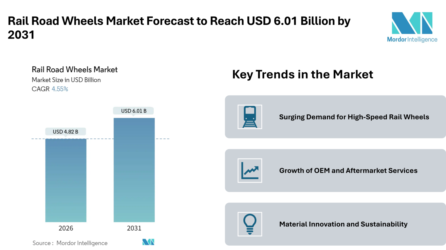 Material Innovation and Sustainability: While rolled carbon-steel remains widely used, the market is seeing a gradual shift toward composite and hybrid materials. These alternatives offer lighter weight, better noise reduction, and improved corrosion resistance. Additionally, environmental considerations are driving adoption of low-carbon wheels, particularly in Europe and North America. This trend aligns with operators’ efforts to meet regulatory and sustainability targets.