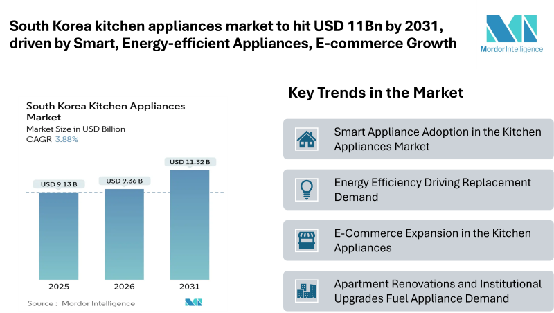 According to Mordor Intelligence, the South Korea kitchen appliances market size is witnessing steady expansion as households and institutions continue to upgrade appliances with connected features and higher energy-efficiency standards. According to industry analysis, the market is expected to increase from USD 9.13 billion in 2025 to USD 9.36 billion in 2026 and reach USD 11.32 billion by 2031, reflecting a CAGR of 3.88%.
