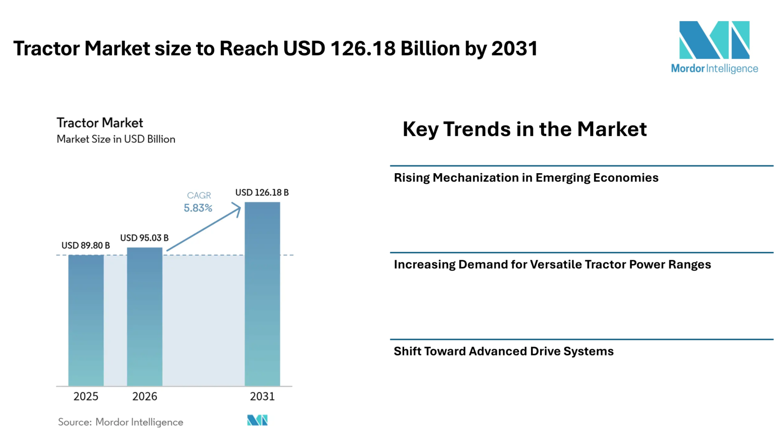 According to Mordor Intelligence, the tractor market size is estimated at USD 95.03 billion in 2026, increasing from USD 89.8 billion in 2025, and is projected to reach USD 126.18 billion by 2031, registering a CAGR of 5.83% during the forecast period.