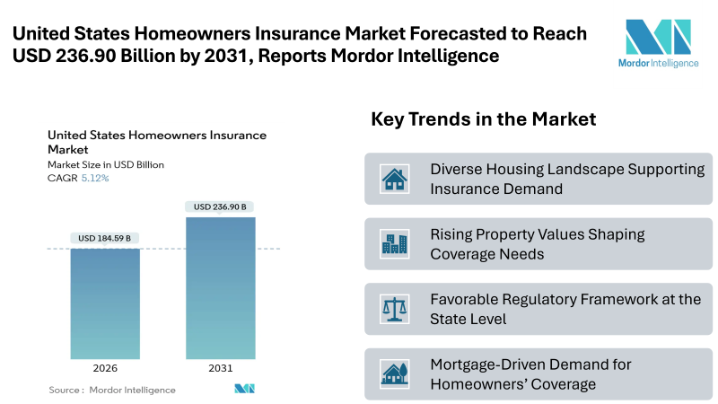 According to Mordor Intelligence, the United States homeowners’ insurance market size is USD 184.59 billion in 2026 and is projected to reach USD 236.9 billion by 2031 at a 5.12% CAGR, reflecting consistent market potential and steady US homeowners’ insurance market growth through to the forecasted year. This market remains a core element of residential risk protection, with required coverage tied closely to mortgage financing and homeowner financial planning practices. Mortgage-linked demand, supportive regulatory environments, and persistent housing stock expansion underpin ongoing baseline demand across diverse regions and risk profiles.