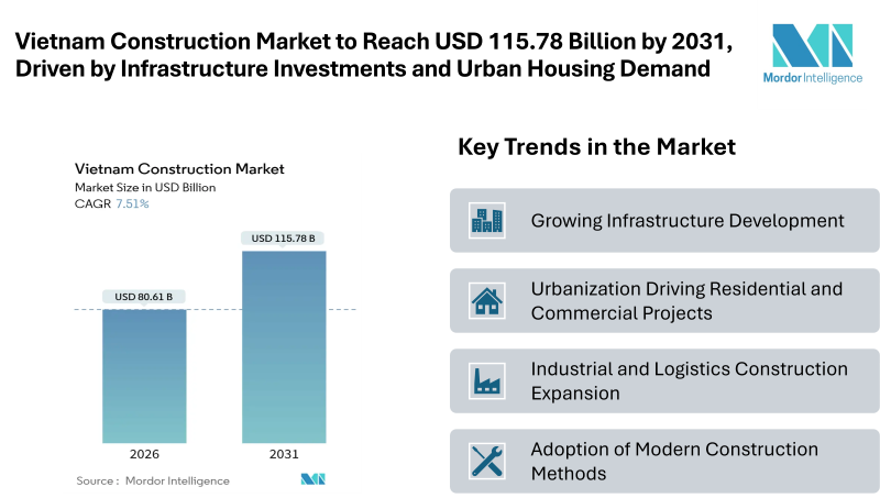 According to Mordor Intelligence, the Vietnam construction market size projected to grow from USD 80.61 billion in 2026 to USD 115.78 billion by 2031, reflecting a healthy growth rate. This growth is driven by government-backed infrastructure projects, rising foreign direct investment, and a steady rebound in residential and commercial construction. The current regulatory framework, including new real estate laws enacted in 2024, has improved project bankability and expedited permitting processes, encouraging both public and private sector participation.